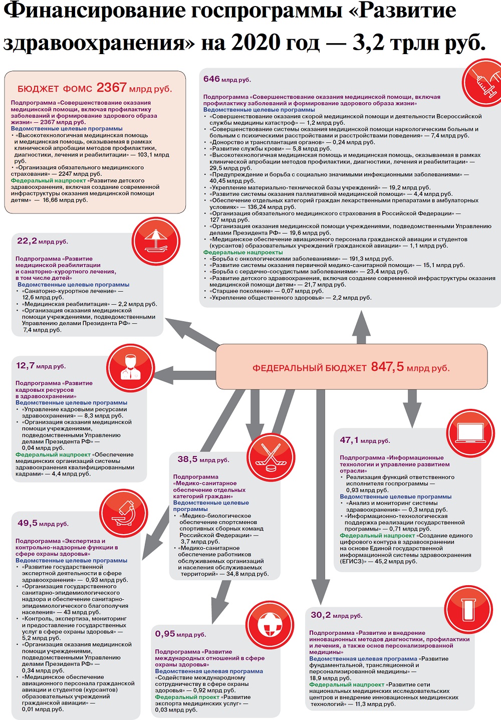 В 2019 году ситуация стала меняться. Из ФОМС на госпрограмму пошло 2,2 трлн руб., из федерального бюджета — 506,11 млрд руб. В 2020 году финансирование фонда составит 2,36 трлн руб., а из федеральной казны — 847,5 млрд руб. Из этих 847,5 млрд руб. в рамках нацпроектов выделяется 299 млрд руб.